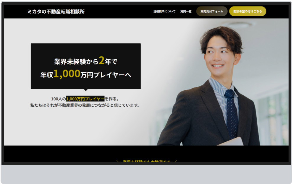 ミカタの不動産転職相談所は、「未経験から2年で年収1,000万円プレイヤーを輩出する」をコンセプトに、これから不動産売買仲介を目指す方の転職をサポートします。