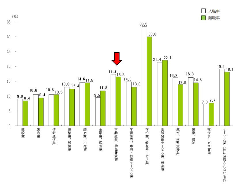 平成29年度、厚生労働省の発表した各業界の入職率と離職率をみると、不動産業界全体の離職率は16.5%です。